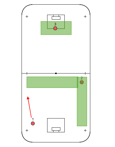 Spieler 3 läuft vor dem Tor herum, kann Pässe direkt oder über die Bande in die Ecke bekommen.